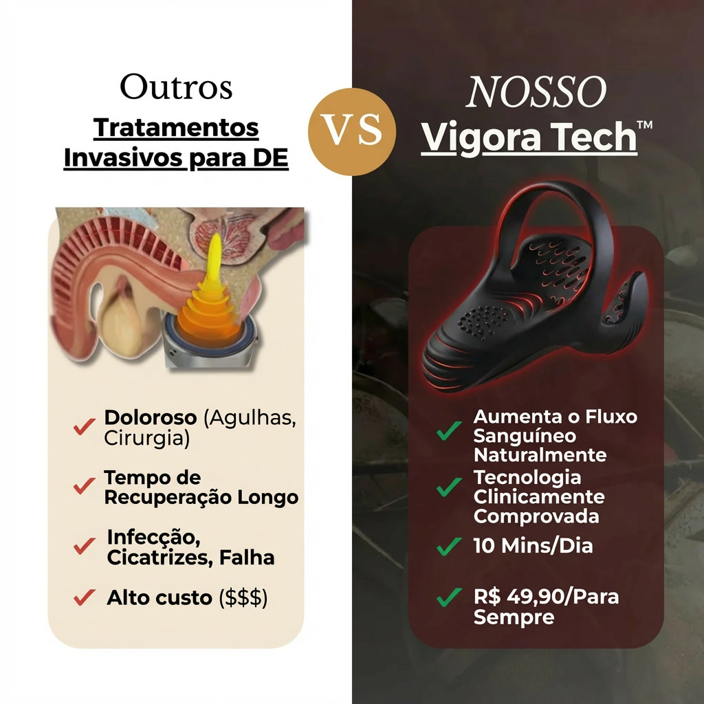 O VigoraTech™ oferece uma alternativa livre de medicamentos a pílulas e procedimentos invasivos. Seu design não invasivo apoia a função natural sem a necessidade de químicos, prescrições ou efeitos colaterais, tornando-o uma solução segura e sustentável para uso a longo prazo.